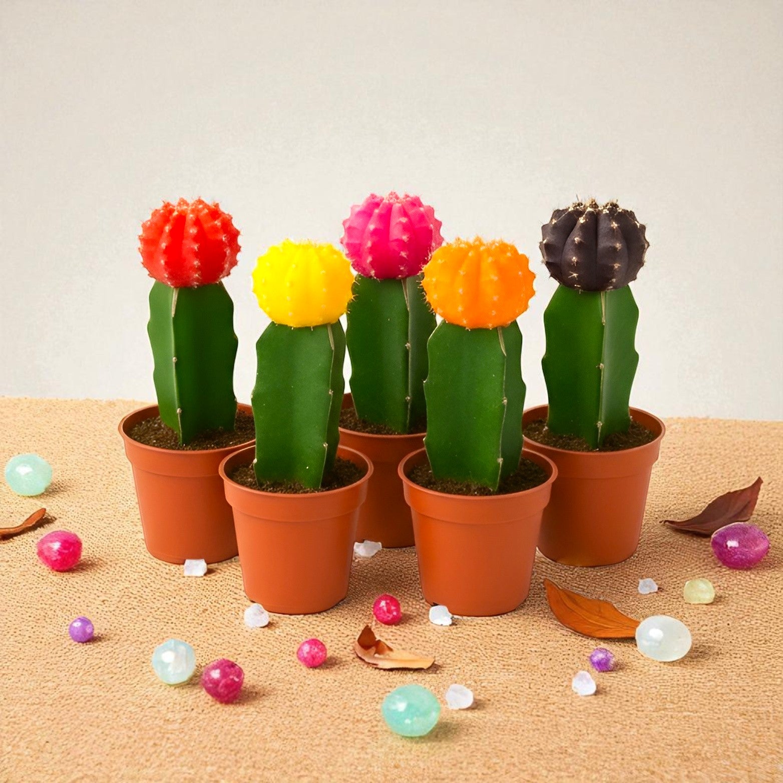 Grafted Cactus:Each plant features a colorful top grafted onto a green rootstock for strong growth.